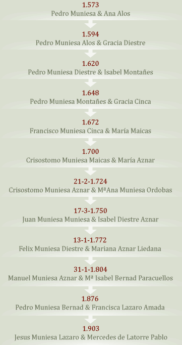 Incluimos aquí la genealogía de la familia Muniesa desde sus orígenes en el siglo XVI hasta comienzos del siglo XX.